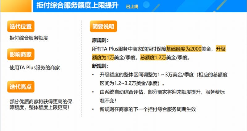 拒付综合服务升级、信用保障额度升级等一系列权益,使用更便捷、保障更全面,服务更优质!