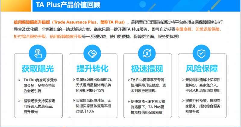 信用保障服务升级版(Trade Assurance Plus,简称TA Plus),是阿里巴巴国际站通过将平台各项交易保障服务进行整合及优化后,全新推出的一站式解决方案。商家只需一键开通TA Plus服务,即可自动获得专属商机、无忧退货保障、