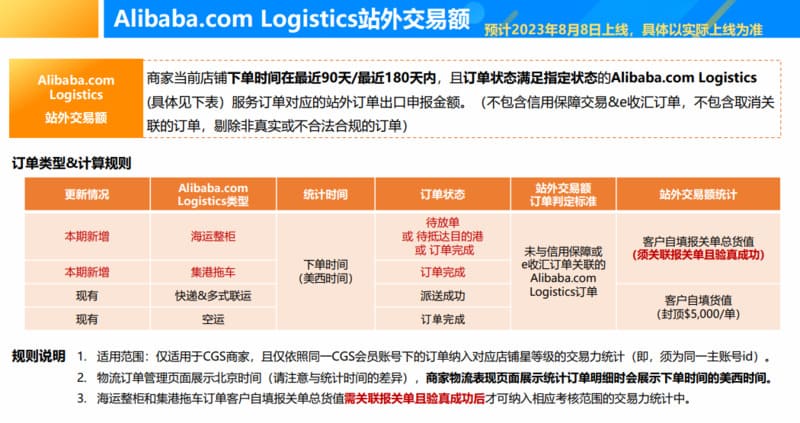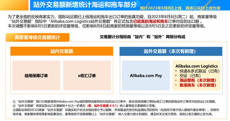 为了更全面的反映商家实力,国际站近期已上线海运和拖车出口订单的验真功能,自2023年8月8日(周二)起,商家星等级 “站外交易额”指标中“Alibaba.com Logistics站外交易额”将正式包含已验真的海运和拖车订单对应的出口额 。 本次调整不影响8月5日更新的评定星等级,仅影响8月8日起商家的预测星等级以及9月5日及之后更新的评定星等级。